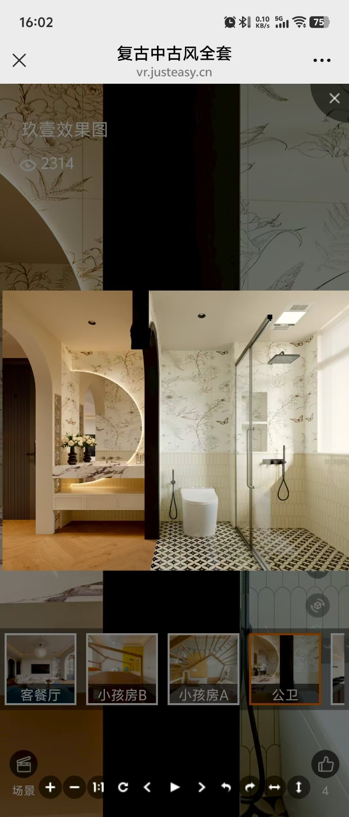 这是复古中古风格的卫生间,充满精致韵味。墙面饰以带有植物、蝴蝶图案的花纹瓷砖,营造自然复古氛围。洗手台区域设有圆形镜子,搭配灯带,柔和明亮;大理石台面搭配精致花瓶摆件,增添优雅感。地面黑白几何图案瓷砖复古又时尚 。马桶与玻璃淋浴房分区明确,淋浴设施简洁实用,顶部的嵌入式灯具保证了充足照明,整体兼具美观与实用性。