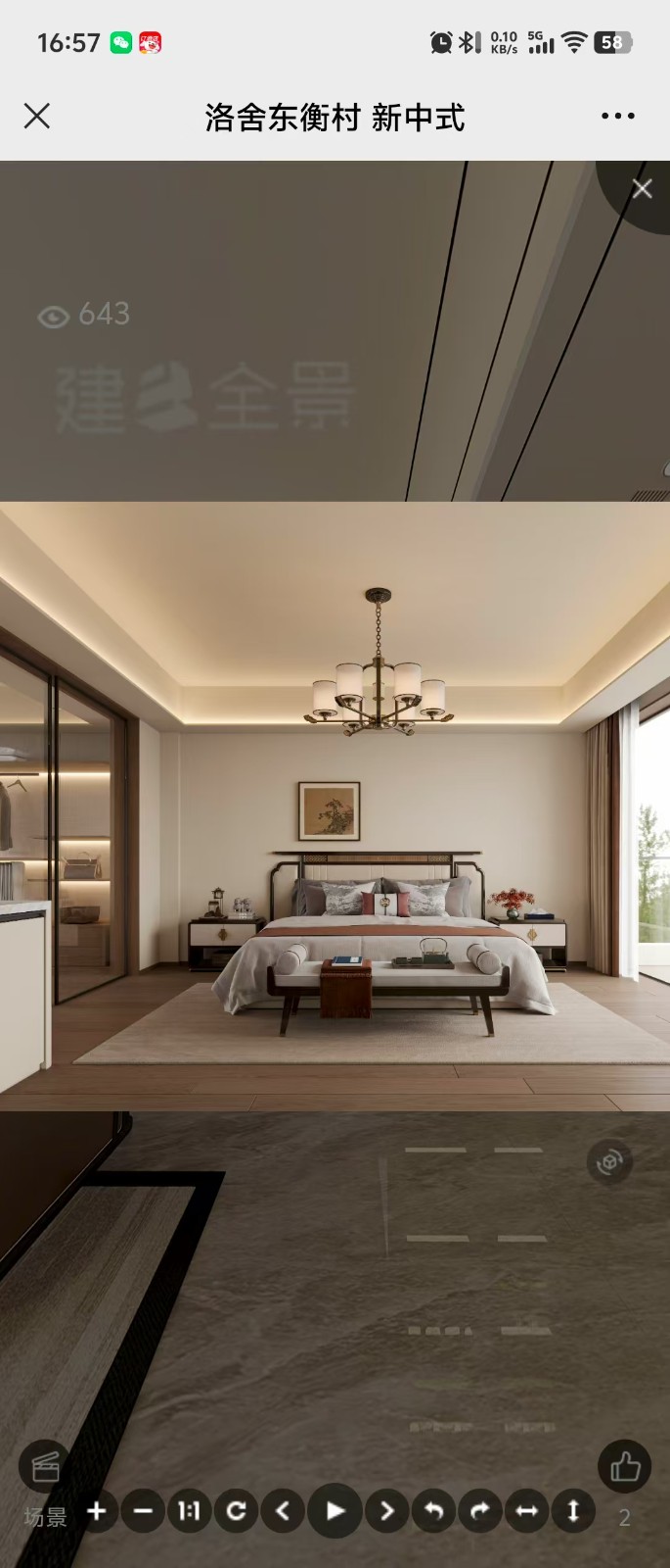 这是新中式客厅,整体风格雅致。大面积落地窗引入充足自然光线,窗外绿意盎然。吊顶搭配中式吊灯,增添韵味。墙面融合大理石与木质元素,电视墙简约大气。浅色系沙发搭配中式抱枕,茶几造型别致,地毯纹理独特,营造出舒适且富有东方美学的空间氛围 。