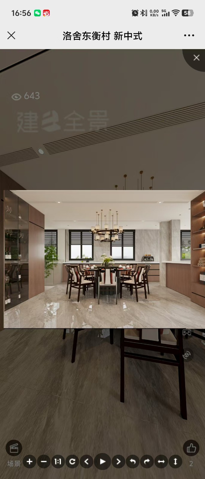 这是新中式风格的餐饮空间,非传统独立厨房。开放式布局,与餐厅融合。中央设圆形餐桌,配中式座椅,上方垂吊多层吊灯,营造雅致用餐氛围。一侧有酒柜,可陈列美酒;另一侧是操作区,结合收纳与备餐功能,墙面石材、木质柜体搭配,简洁大气,窗外绿植点缀,让烹饪用餐兼具舒适与美感 。