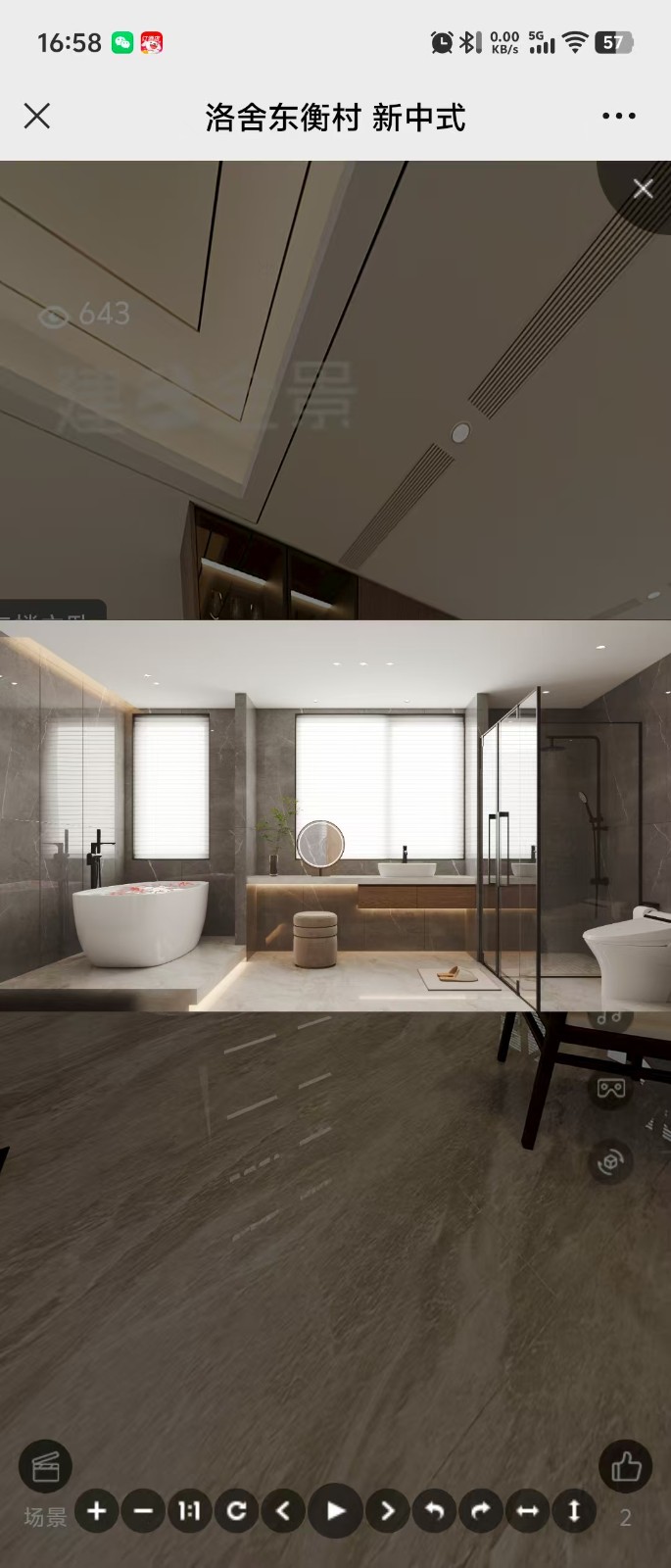 这是新中式卫生间,整体设计简约大气。空间开阔,以灰色石材为主色调,营造沉稳质感。左侧设独立浴缸,搭配绿植点缀;中间是洗手台,圆形镜子与木质柜体结合,下方小凳实用。右侧为淋浴区与马桶区,玻璃隔断干湿分离。采光良好,灯光设计精致,融合中式韵味与现代舒适,尽显雅致格调 。