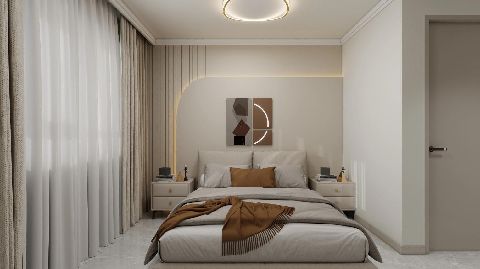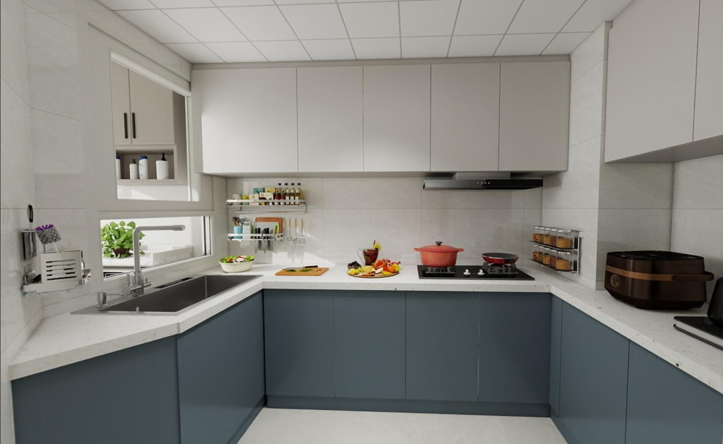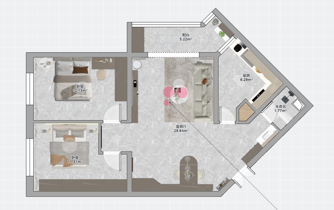 不规则户型 卧室区域周正,采光和通风良好; 厨房卫生间在夹角位置,把每个空间都能运用到位; 功能区划分清晰,有独立的餐厅区域。 控制预算就选现代简约风,美观大气又省钱