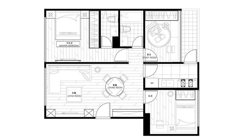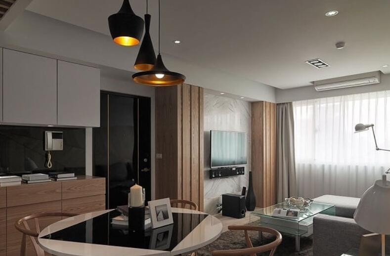 这是83㎡现代简约二居室的案例。除了格局的保留,设计师也将旧有门片重新漆上黑色新彩,与白墙对比出俐落时尚,主卧房床头跳接黑镜延续黑白对比调性,并在床尾处的电视墙处,结合LED光带与间照,延伸墙体线条转折接续天花,进而修饰樑柱,更透过造型柜体的线条变化,小细节中表现雅痞型男的品味质感。