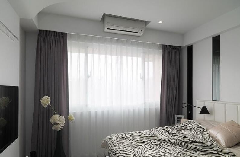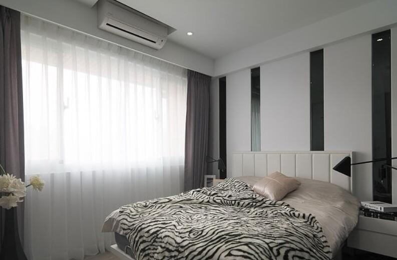 主卧房床头跳接黑镜设计,延续男主人喜爱的黑白时尚风格。