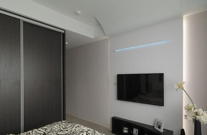 黑色电视墙与造型机柜,结合LED光带与间照,在转折延伸的墙面造型中营造黑白时尚感。