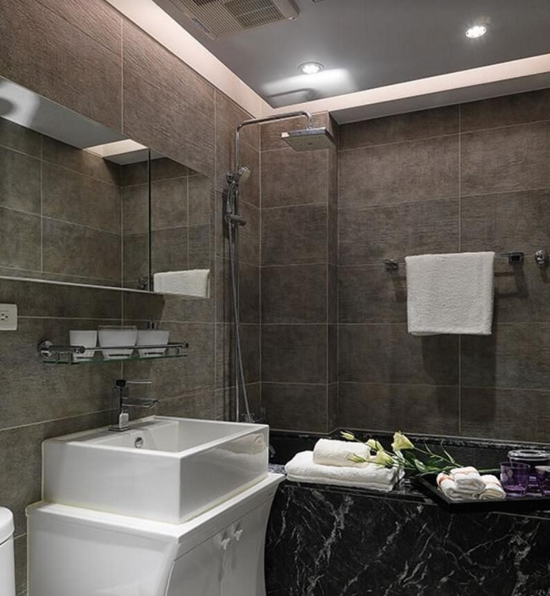 重新贴覆磁砖与砌做的浴缸,打造简洁俐落的主卫浴风格。