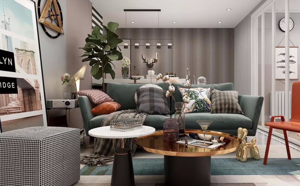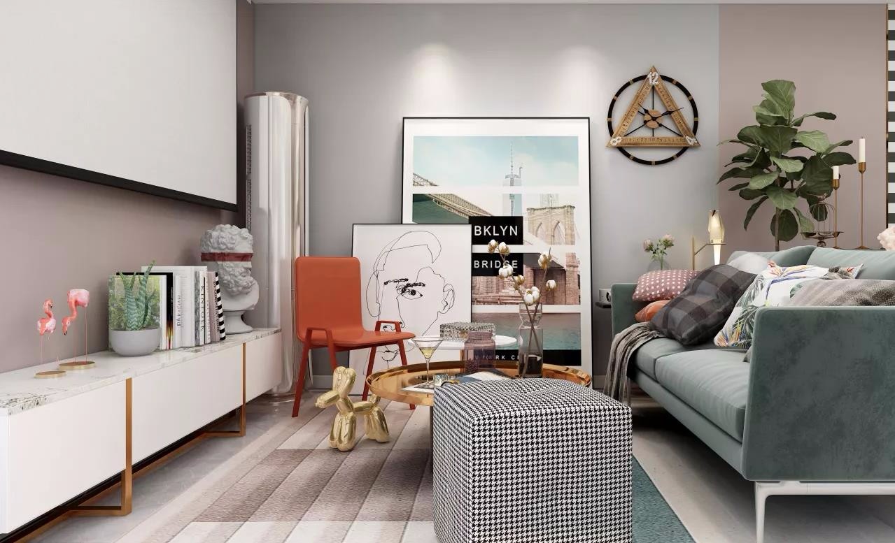 本方案为现代混搭轻奢风格,主基调为灰色、粉色和淡绿色,另外采用橙色作为跳色来点缀、活跃空间氛围。
