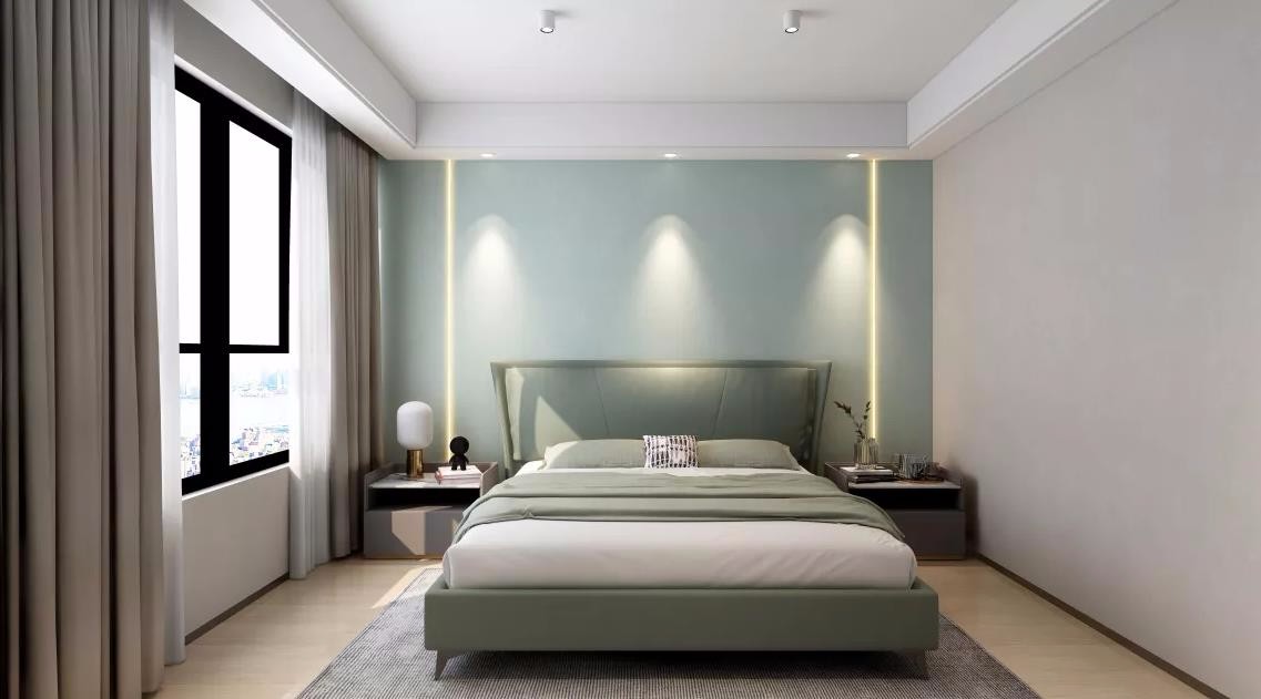卧室采用牛油果色和白色搭配,简洁明亮,简约现代