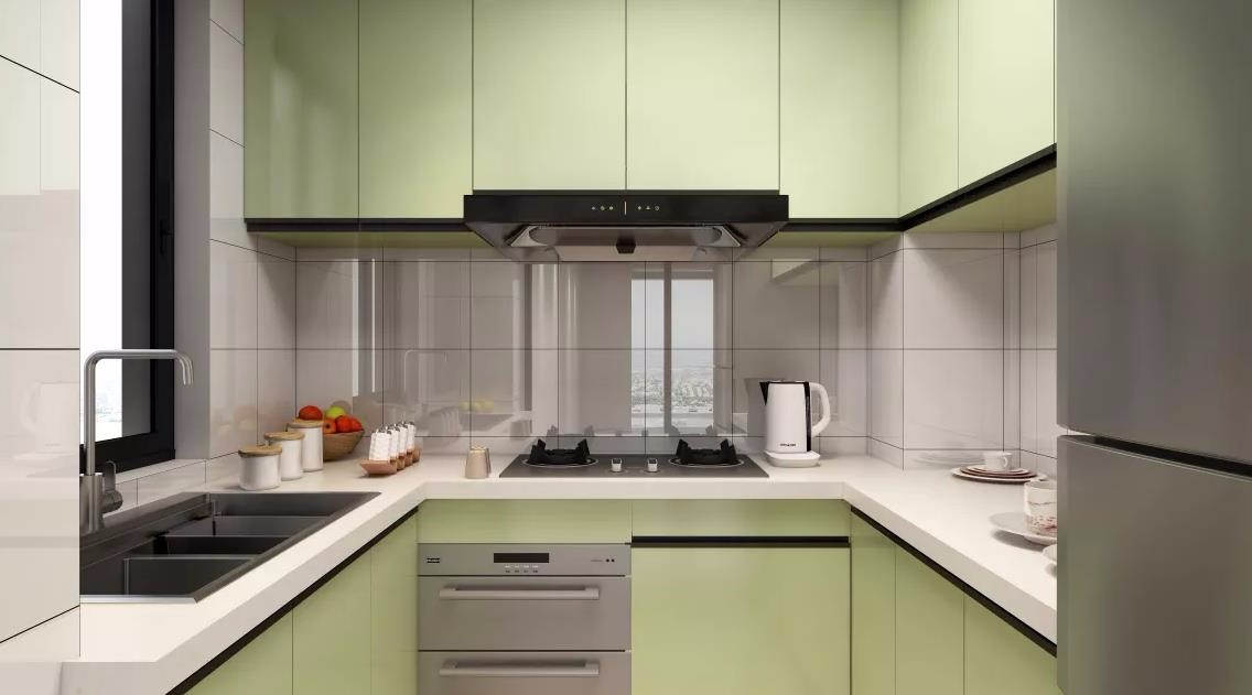 厨房上下柜台颜色都采用牛油果色,简约时尚,