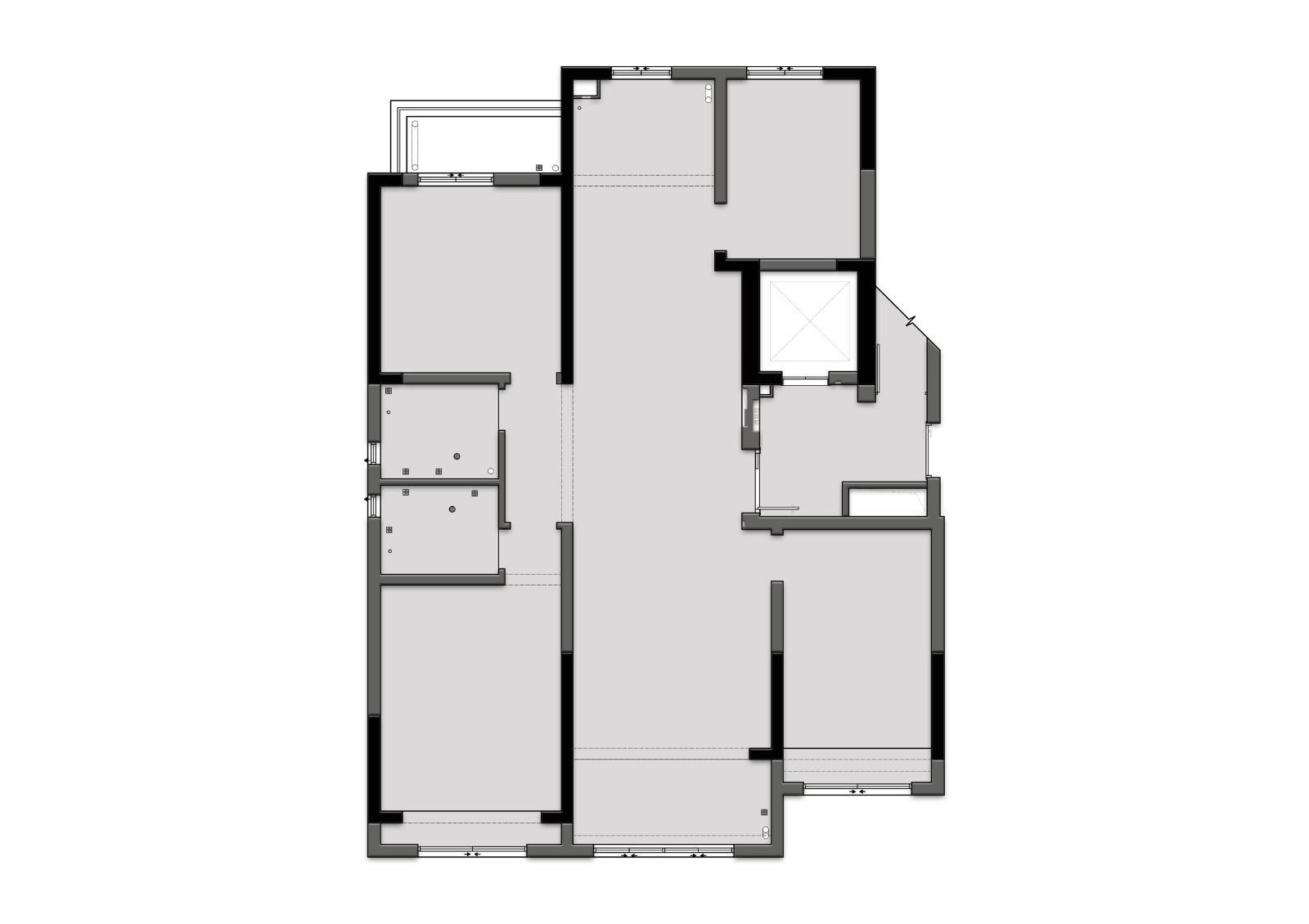 原始户型图 大刀阔斧的调整并不适用于这种情况,在所有空间都需要发挥刚需功能的时候,我们需要细致的观察空间问题与潜力。 两个卫生间面积都比较有限,基本一样大,但是在家庭成员比较多的时候,需要更全面的发挥功能。 厨房宽度不够,会对日常操作产生限制。 另外也需要避免入户门对着卫生间门的情况。对于一梯一户的住宅,我们可以把落尘区完全放在入户门外,避免占用室内空间。 对两个卫生间的使用程度进行调整,让它们功