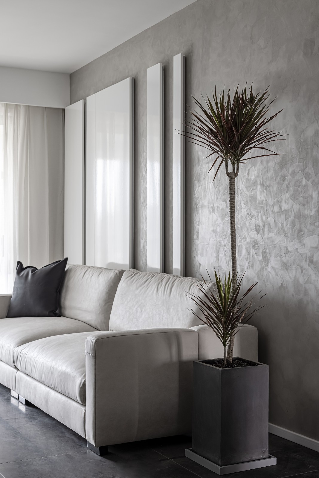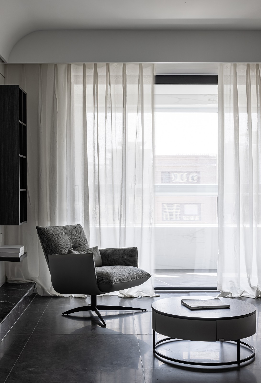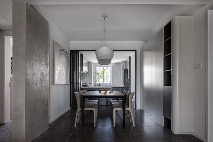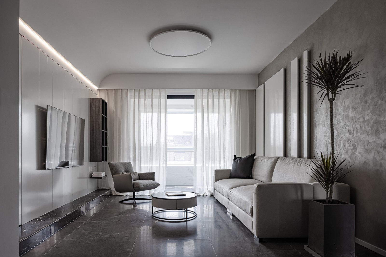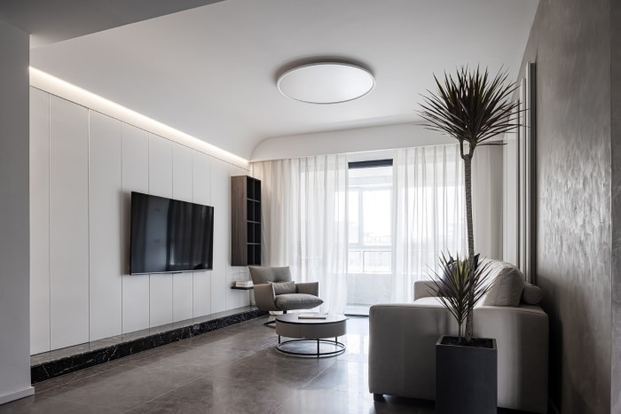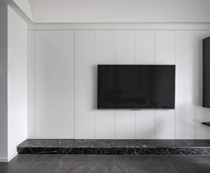墙面肌理的粗粝毕现,通过光线传递的这种变化自然的变成装饰,是空间内在的风景。电视背景墙我们让它保持光滑洁净的的表面,与对立的沙发背景墙产生微妙的对抗,在光线中闪耀或是朦胧但都大抵都处在自然平静中,繁简相融,于是这种对抗被抚平。在白色的的电视背景墙表面推敲比例自然留缝,卧室的房门以隐形的形式融入墙面,门的轮廓线按既定韵律与墙面线条重合,隐形感被再次强化,通过统一的整体来表现简约的“韵律”。推开门,隐