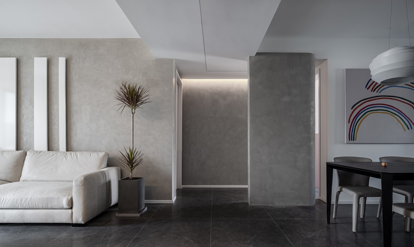 进入居所,水泥漆的墙面以清水气质与斑驳肌理包裹着静谧、沉着与细腻,悄无声息的登场,视觉感受并不是强有力的冲击的却可以将情绪抻平,用弱反光的涂料,模拟柔和的感觉,在清晰的实体世界中,难得片刻模糊。