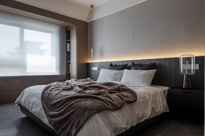 木质包覆主卧窗口的轮廓,与窗边收纳以及矮柜、台面连为一体,在空间中形成令人安心的稳定性,不矫饰,不浮夸,是务实而真挚的功能装置。
