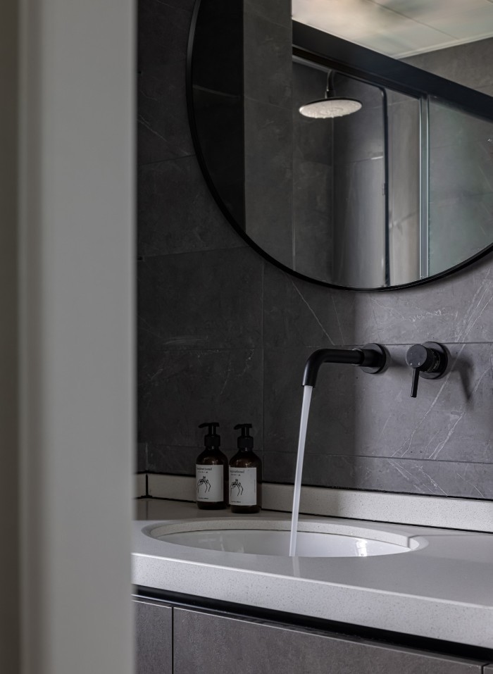 卫生间的入墙式水龙头将供水管件藏在墙体内部,节省空间,台面位置也被释放出来,用一些细节在小空间中表现简约清爽。