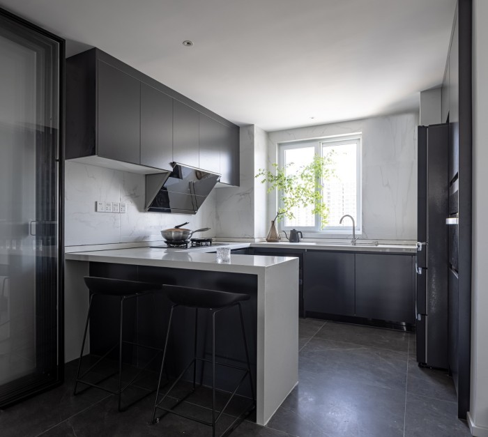 厨房需要关照到一系列做饭时的步骤和顺序,U型的操作台面可以容纳好一连串的行动,将过程密切相扣。而在这个空间里,我们将U型旋转,附加了吧台功能,厨房开始具有互动性,让交流和协作自然的发生在这里。