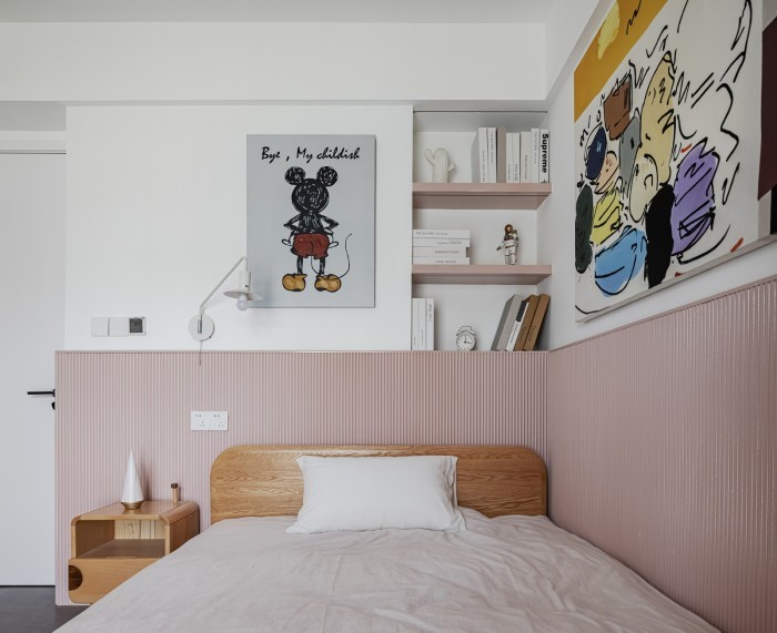 儿童房睡眠区的墙面,用半高的波浪板围裹,喷涂粉色混油漆就是小女孩气息的卧室。小立柜细致分区为儿童衣物提供更清晰的收纳规划,柜门是藤条编制,自然疏松的质地兼顾防尘透气。