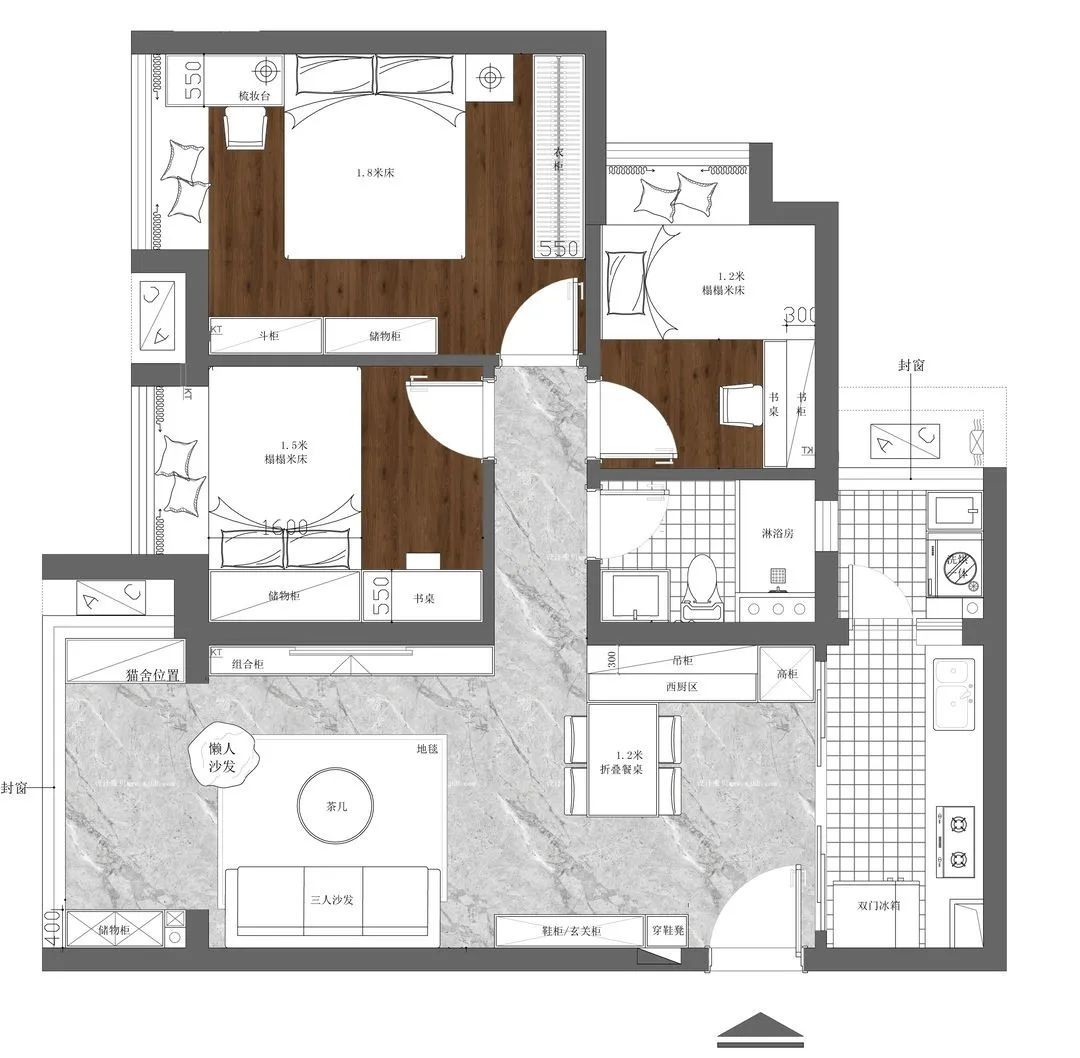 原户型为80㎡左右精装三房,户型格局都还不错,拥有三房可以很好地满足日常需求,不足的是缺乏收纳。 装修上没有做很大改动,将客厅阳台打通,同步在阳台定制储物柜,以提高居家收纳能力。除了主卧之外,其他房间都采用定制设计,既增加储物收纳,又提高空间利用率