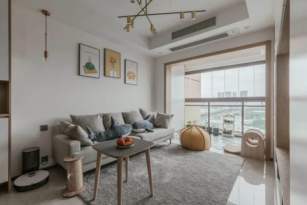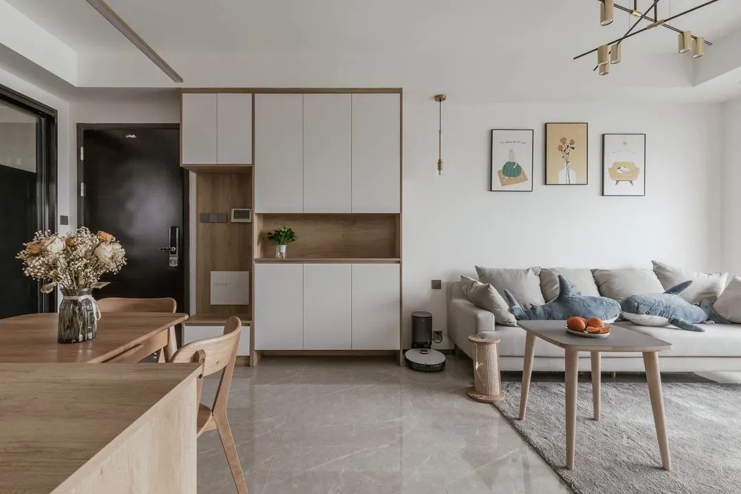 客厅拆除推拉门设计,将阳台纳入客厅,扩大使用面积让空间更开阔。客厅墙面以纯净白色为基调,大量木质材料做延伸。阳台打通后,定制了储物柜。