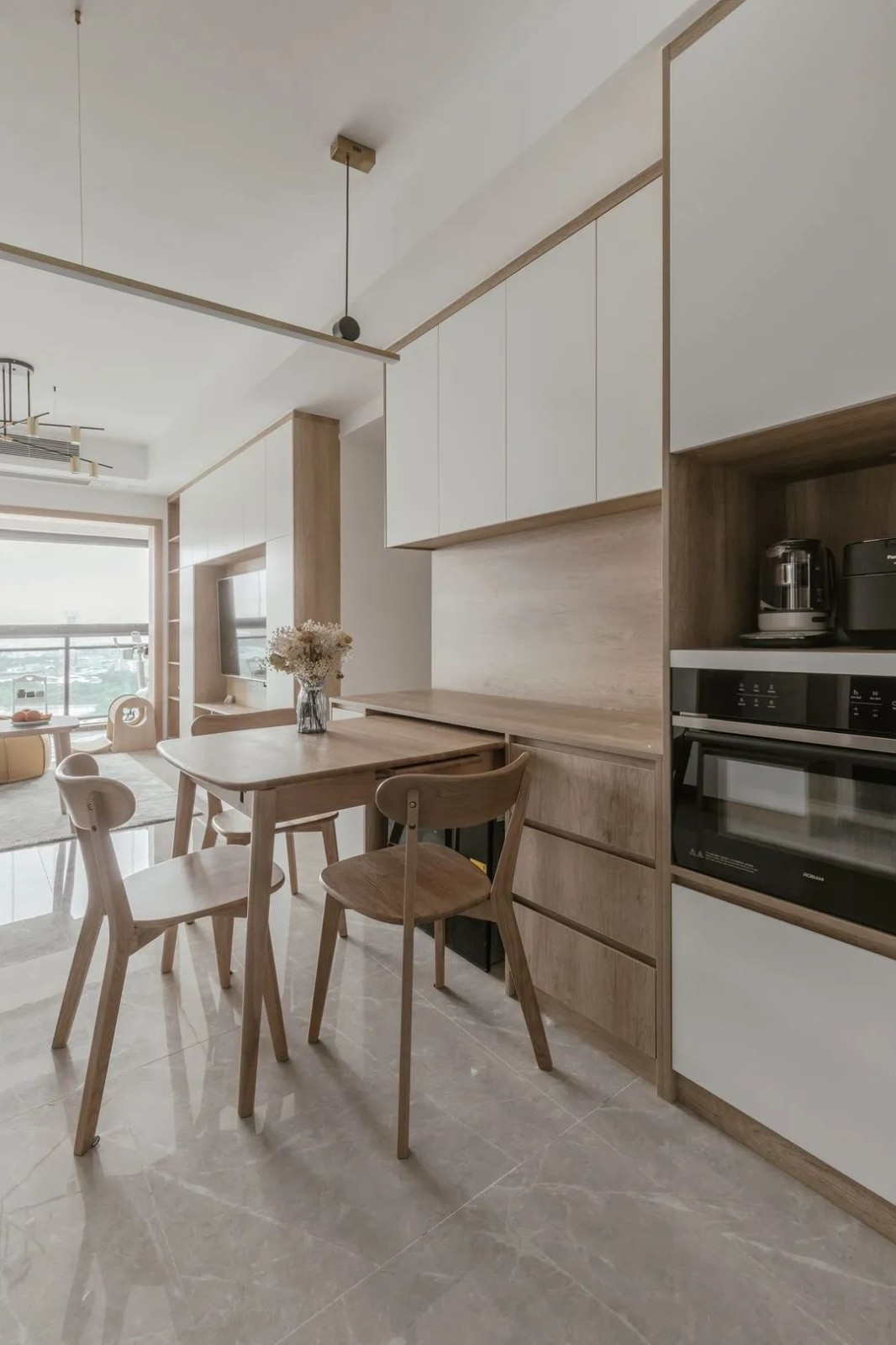 取消了传统餐桌布置,利用组合柜+伸缩式餐桌,不仅解决了日常用餐问题,还让空间更开阔灵活。大容量的餐边柜设计,提供了足够多的收纳空间。