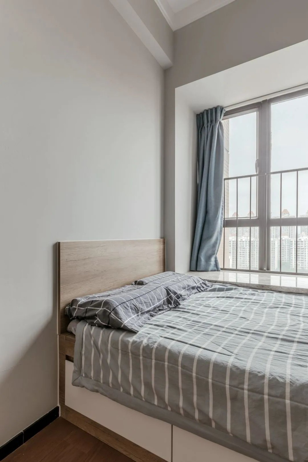 客房空间紧凑,没有太多花里胡哨的设计,仅仅定制了榻榻米床,满足睡眠需求,底部又自带抽屉柜储物,对小空间而言还是非常不错的。