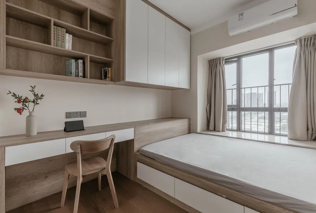 整体采用定制设计,榻榻米书桌一体,视觉整体感更好。连接书桌的床头靠背,做了上掀式储物,方便收纳一些小物件。