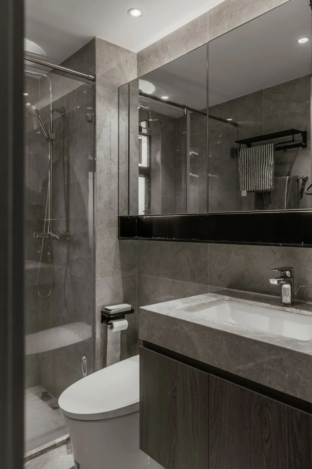 卫生间通铺灰色瓷砖,质感满满。空间比较局促,浴室柜尺寸采用定制,悬挂安装方式。镜柜辅助收纳,顶部安装了灯带辅助照明。