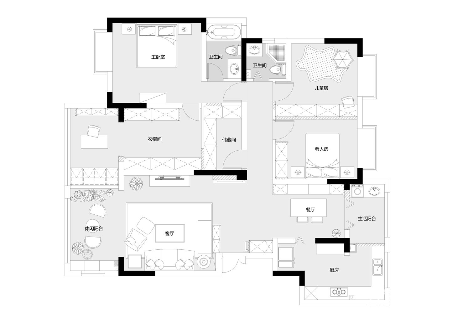 整体户型方正,厨房和卫生间稍显小巧,卧室空间大。