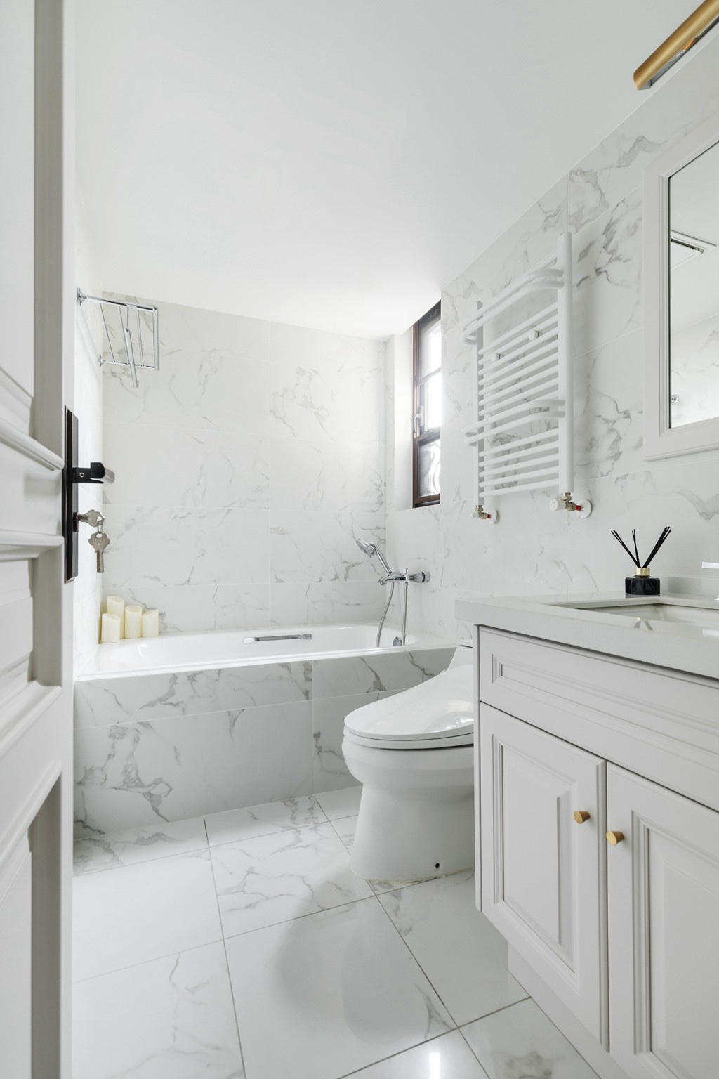 卫生间也以白色调为主, 搭配从窗外透进来的阳光 显得格外舒适