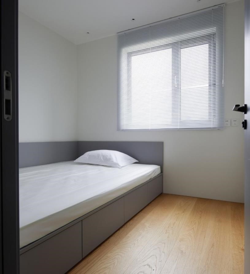 北侧老人房与主卧呈对称分布,内部为榻榻米设计,床头柜体提供强大的储物空间。