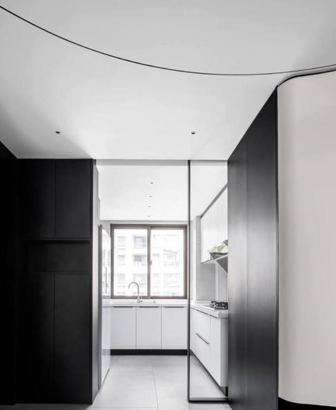 L型厨房。透明推拉门,增加采光度。