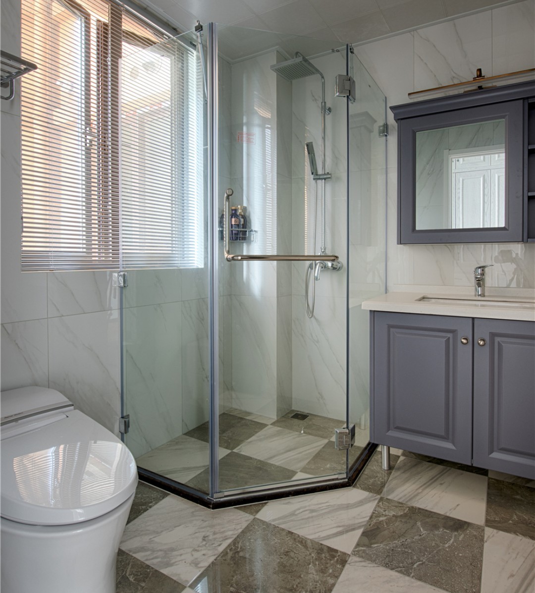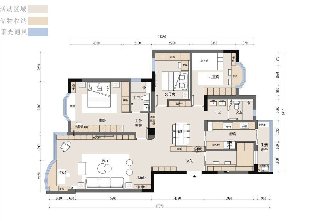户型改动不大,所以在地面材质和天花吊顶上巧用设计,根据业主生活习惯以及功能需求,在原户型基础上把主卫和衣帽间进行改造,把过道墙打了45公分进去,做了一个大大的过道柜,可以解决两个次卧除了衣柜以外的其他的储物空间,能放很多书和杂物,景观阳台处也满足储物与休闲兼备的功能性。
