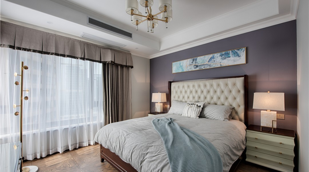 主卧室,采光十足,床头选用跳色为背景,使用素色窗帘搭配,讨巧地运用金色去凸显空间的精致度。显得空间色系整体,每一处都升华着空间的质感。