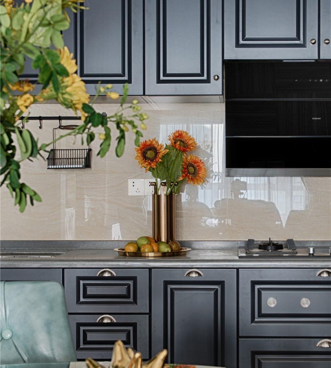 客厅家具质感温润而自然,沙发铆钉的细节体现出家私的精致感,抱枕也是选用同色系,使空间气质整体统一!