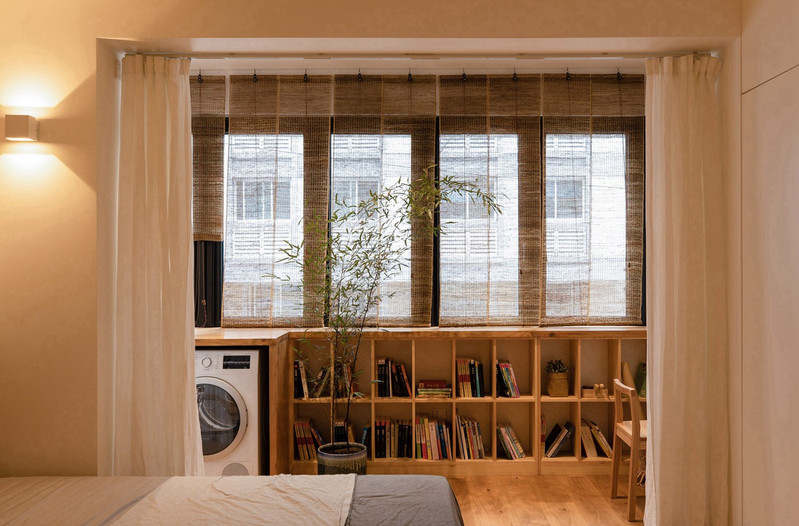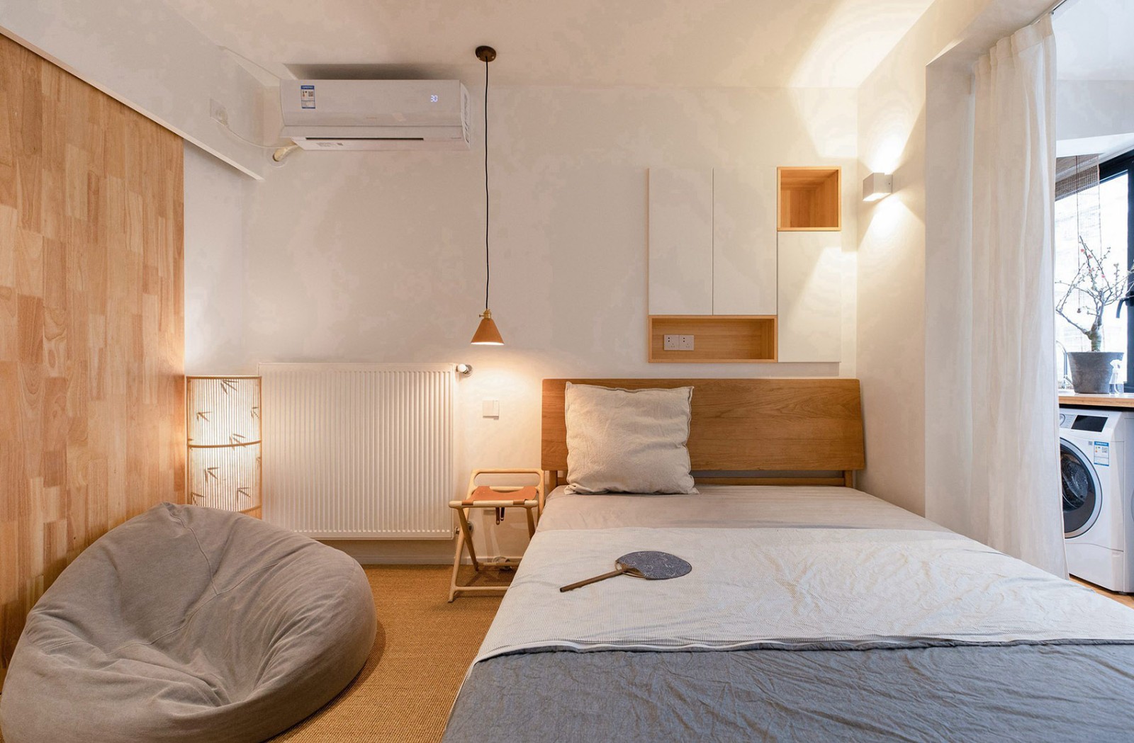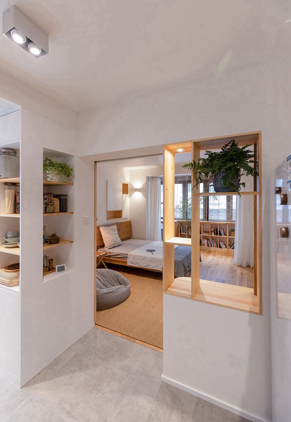 这是一套45平米的学区房,原本老房子的格局清晰可见,一大一小两间卧室,中间的客餐厅封闭而局促。但苦于砖混结构,承重墙体无法移动。设计需要思考:1.如何激活公共空间以适应新的居住方式。2. 空间布局不合理,需要在有限空间里实现功能复合。3.探索小户型空间里“小中见大”这个永恒的主题。“小中见大”这个园林里最经典的题目,始终对设计师有着无法抗拒的诱惑力。