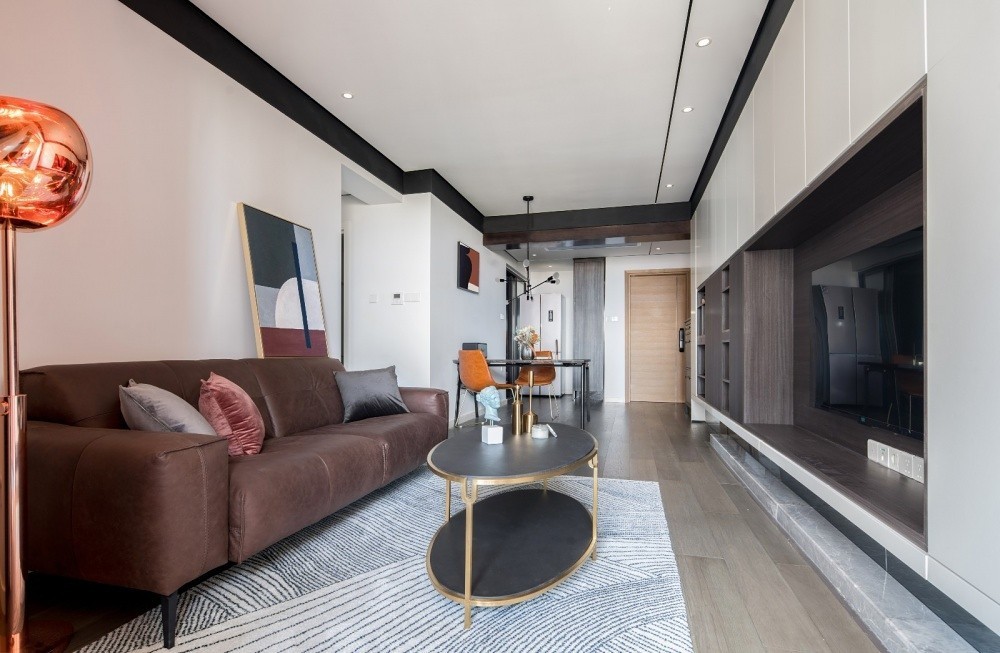 地板竖向排铺,天花线条与柜体延伸,用沉默的语汇拉长客厅的视觉,柜体设开放格客厅不堵塞,柜体封闭区拿来囤货。