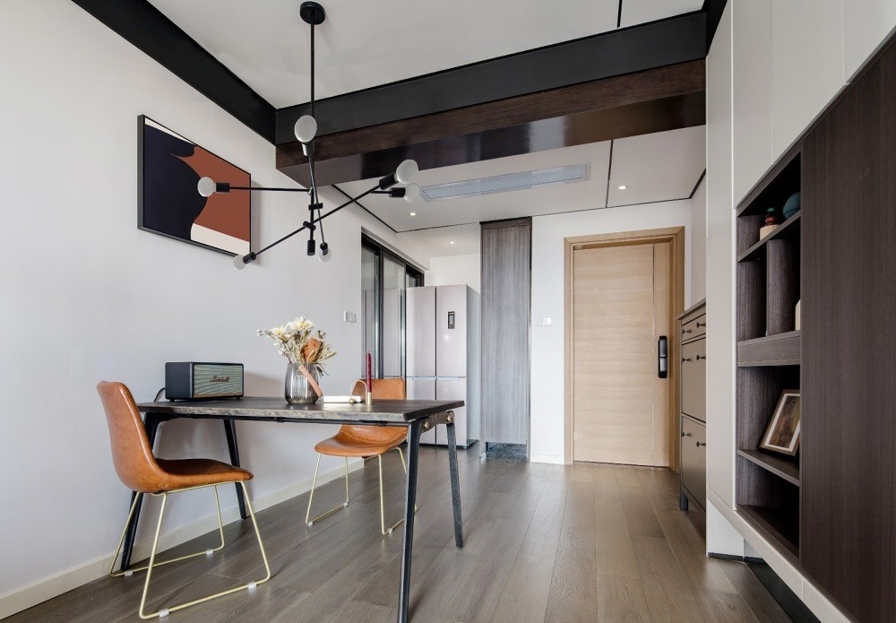 餐厅餐椅皮料呼应挂画,天花梁位包上木皮与黑胡桃木桌面呼应,吊灯释放出张力,两张餐椅使用灵活。