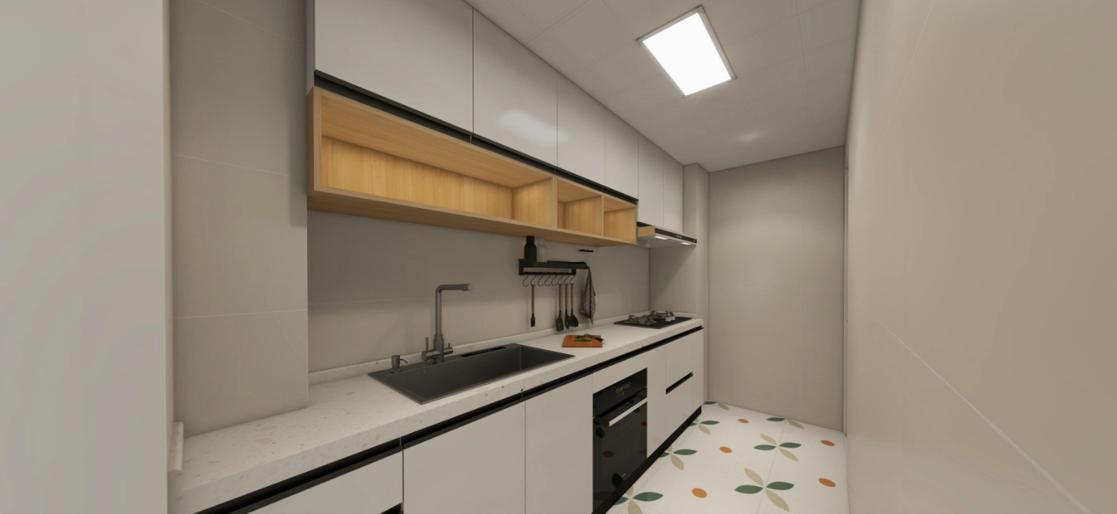 1.一字型的厨房设计,延长了操作台面,将区域进行合理的区域划分,并所以功能区在一条操作台上,方便了日常的烹饪,顶部橱柜的收纳台设计,满足了调料的摆放需求 2.白色的无拉手柜门设计+黑色的边框,整体精简大气,奶咖色的墙面颜色为空间增加了温暖感,地面通铺花色瓷砖,诠释了奶油风的轻奢感