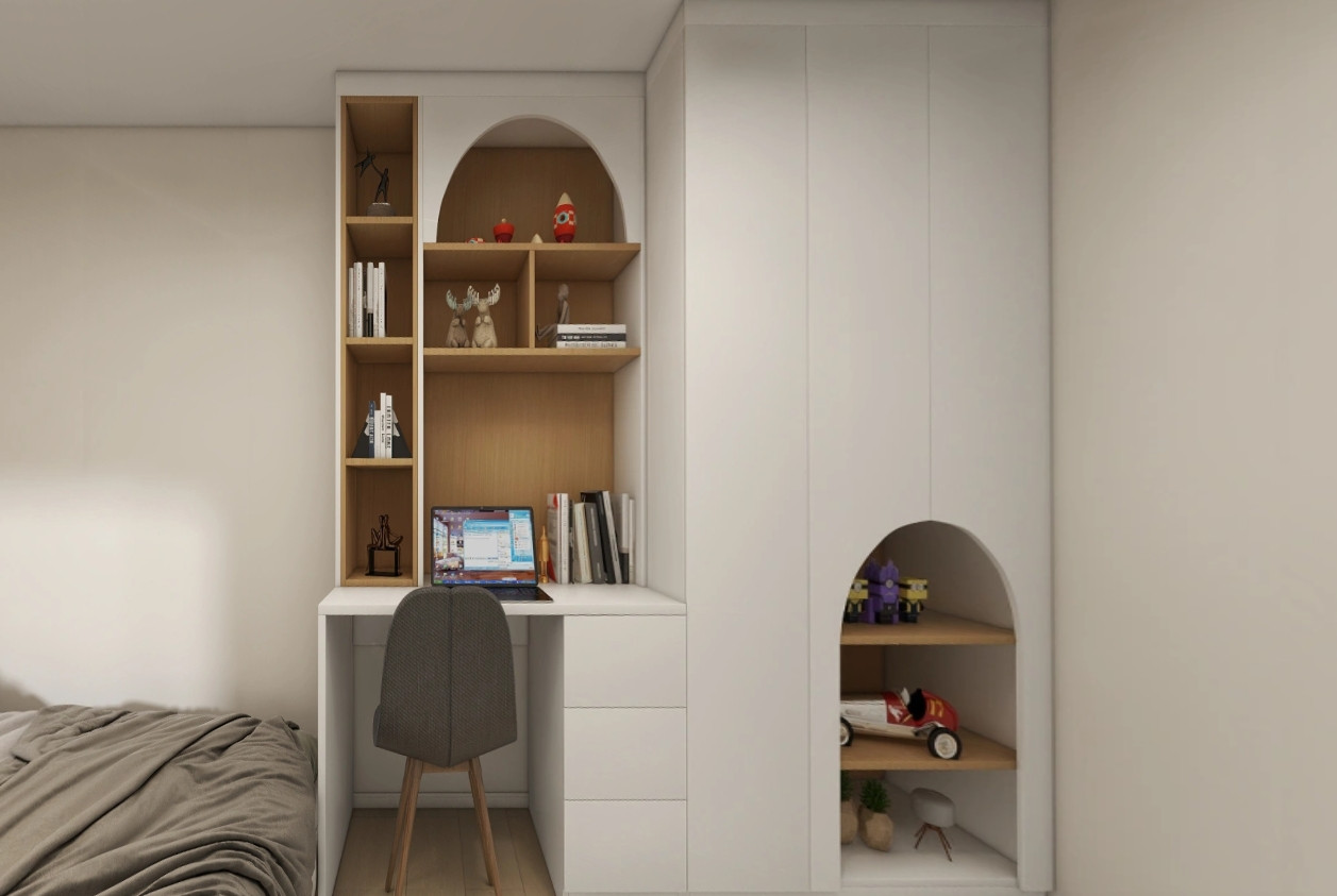 1.儿童房采用咖色的墙面+原木色木地板,营造出舒适、干净的睡眠空间,为了能够增加空间的收纳,采用定制书柜的设计,独特的造型既能收纳又提升了美感,同时也深得孩子的喜爱 2.飘窗的设计保证了室内的采光和通风,同时也给孩子提供了一个日常的休息区
