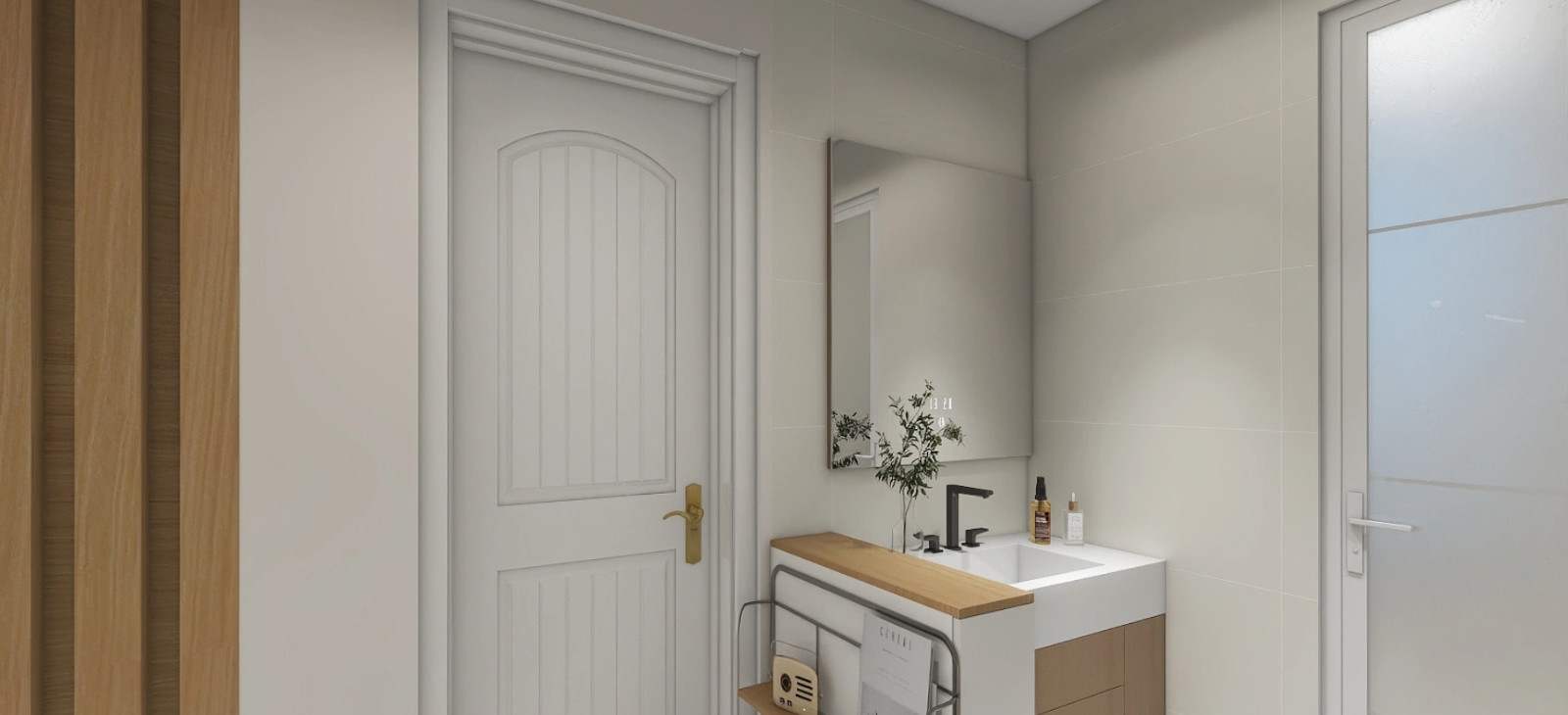 1.卫生间进行干湿分离的设计,方便了日常的使用,洗漱台的设计精致而又简约,让使用时也能有着满满的氛围感和仪式感 2.柔面瓷砖通铺淋浴区,不仅能够做到很好的吸水效果,同时也具备防滑的作用,整体耐看且实用
