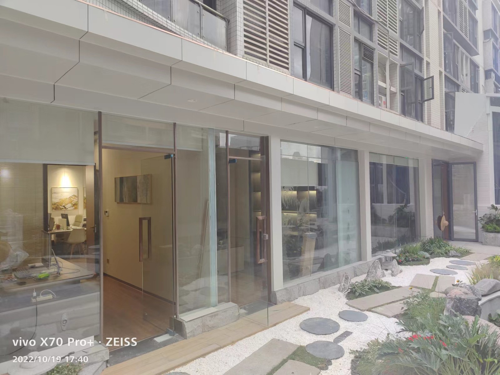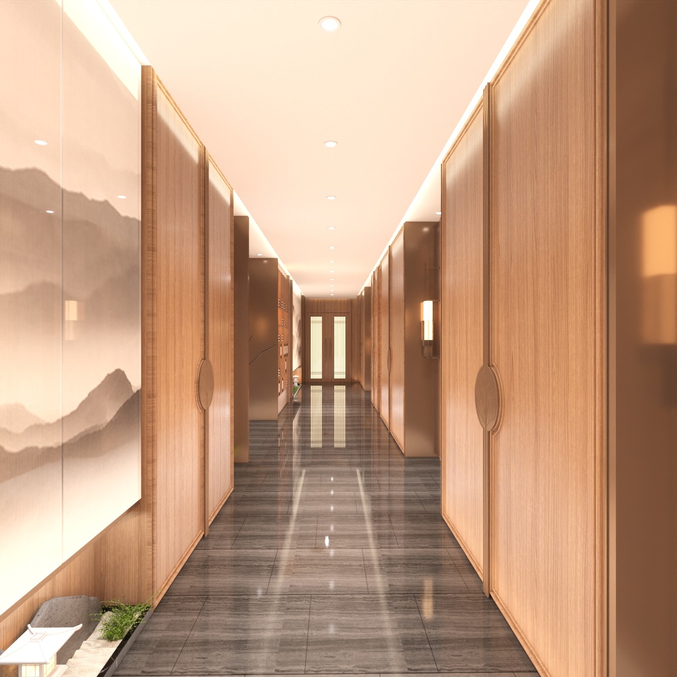 整体设计风格为新中式禅意风,现代与古典结合,墙面古纹,与不锈钢和浅木色相结合,营造出现代都市中的一缕古文人气息