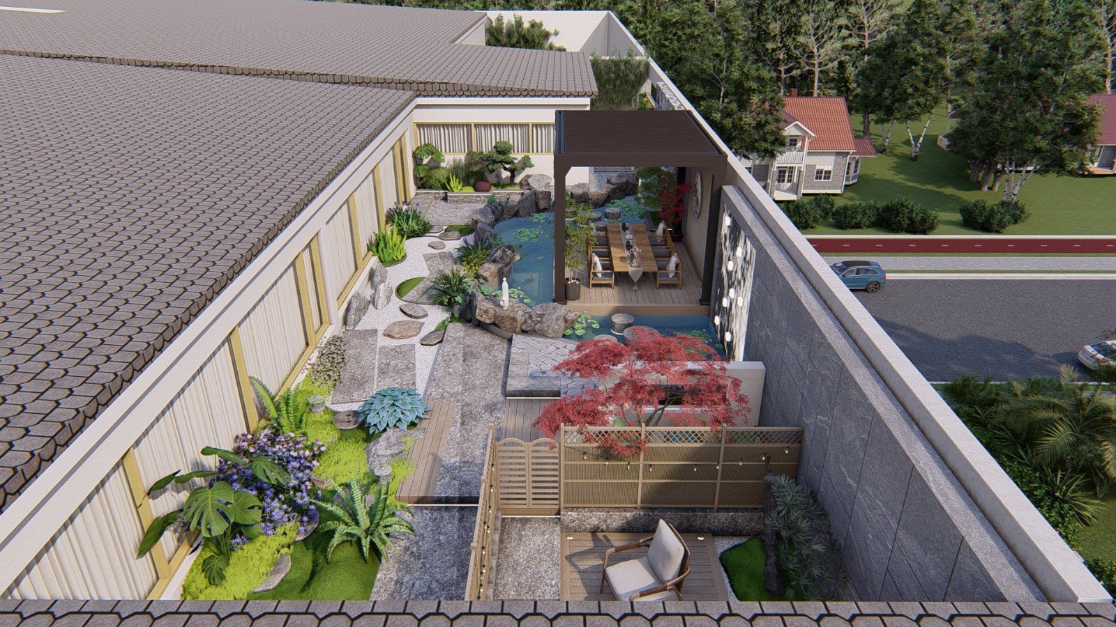 中式禅意的庭院景观,功能丰富,水景环绕凉亭打造惬意的自然景观,位于广州市中心的一道人文的自然景观
