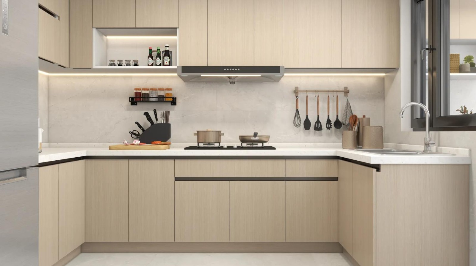 u型厨房,吊柜底板开槽镶的灯条