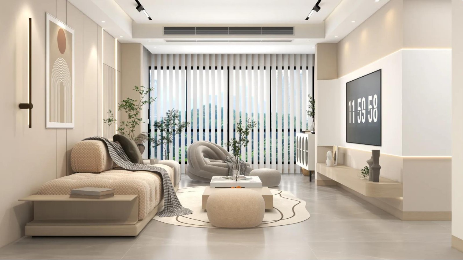 客厅坐的悬空电视柜加无主设计墙面做的护墙板和线条灯