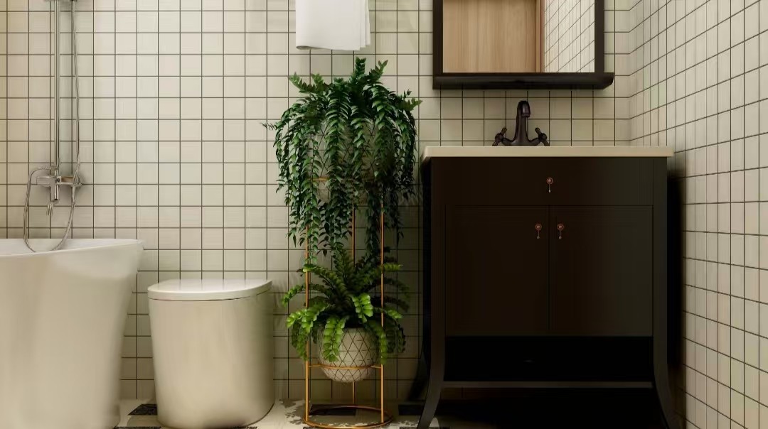 洗手间设计成了复古的感觉,浴缸后面有一个浴室柜收纳洗漱用品。