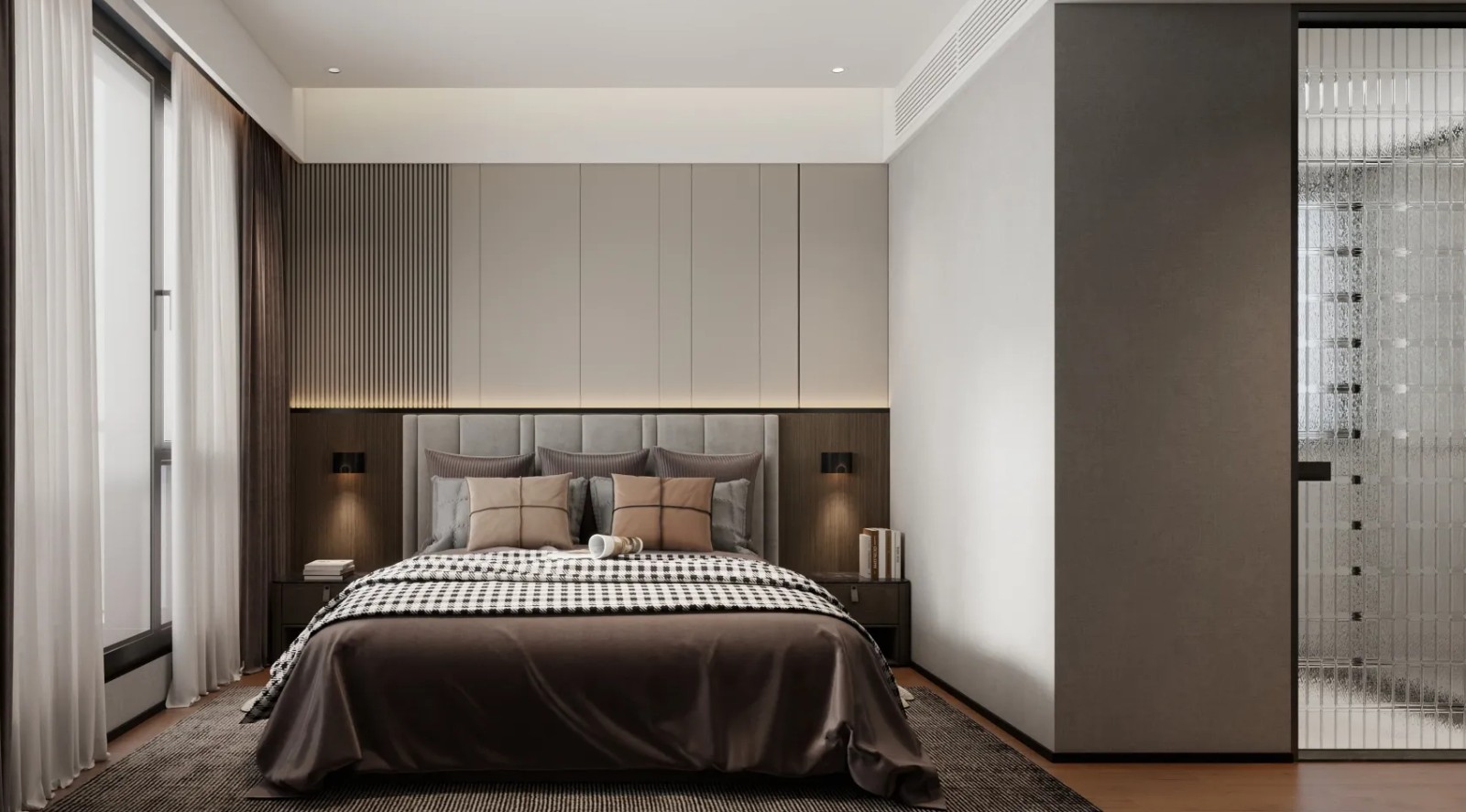 床头背景墙采用软包设计,搭配柔和的灯光,营造出温馨舒适的氛围。床品选择大地色系,与整体色调和谐统一。大面积的窗户引入自然光,增强空间的通透感。旁边的玻璃门设计增加了空间的层次感,整体设计简洁而不失优雅。