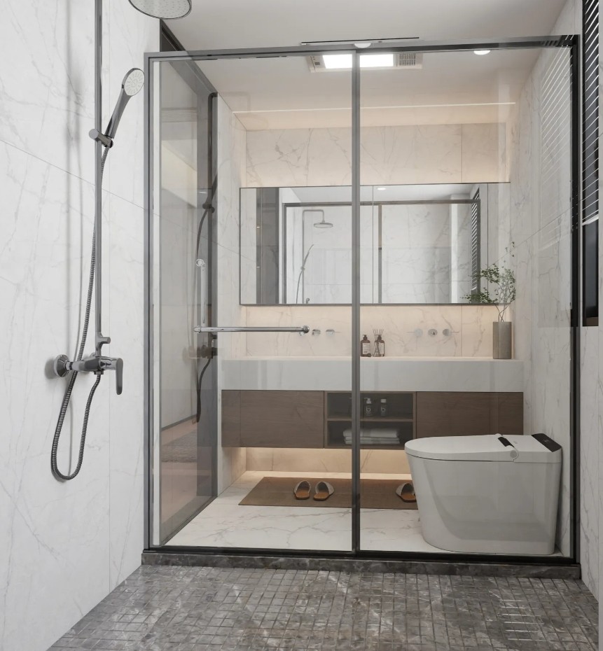 采用大面积的玻璃隔断,使空间显得通透明亮。墙面和地面使用大理石纹理瓷砖,增添了豪华感。简洁的洗手台和悬挂式马桶设计,提升了空间的整洁度。整体布局合理,功能齐全,体现了现代简约的设计理念。