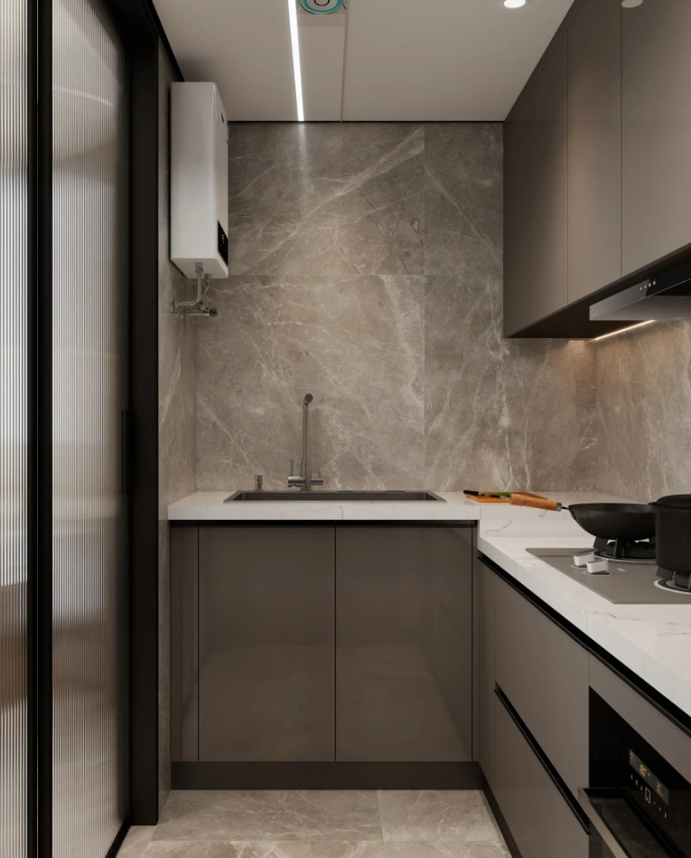 墙面采用大理石纹理瓷砖,搭配深色橱柜,营造出简洁而高雅的氛围。白色台面与深色橱柜形成鲜明对比,增加了空间的层次感。嵌入式电器设计使空间更加整洁,整体布局合理,功能齐全,适合现代家庭使用。