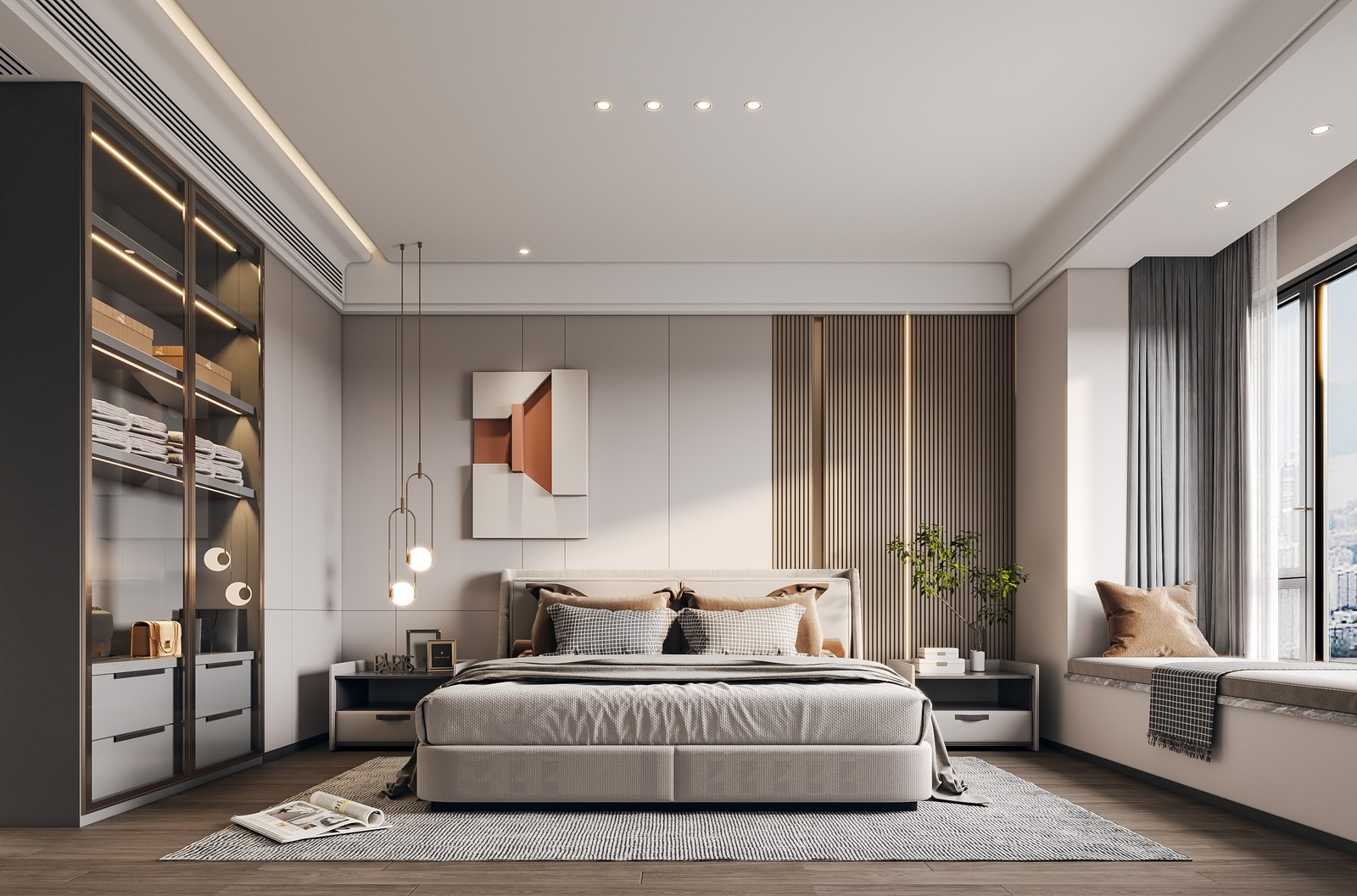 卧室整体偏简约,以灰色和浅木色为主,使整个空间看起来既温馨又舒服,两侧的悬挂吊灯设计精巧,实用与美感并存,储物柜与窗台的设计提升了空间的利用率和舒适度。