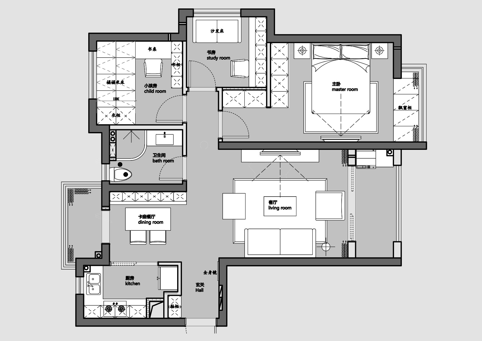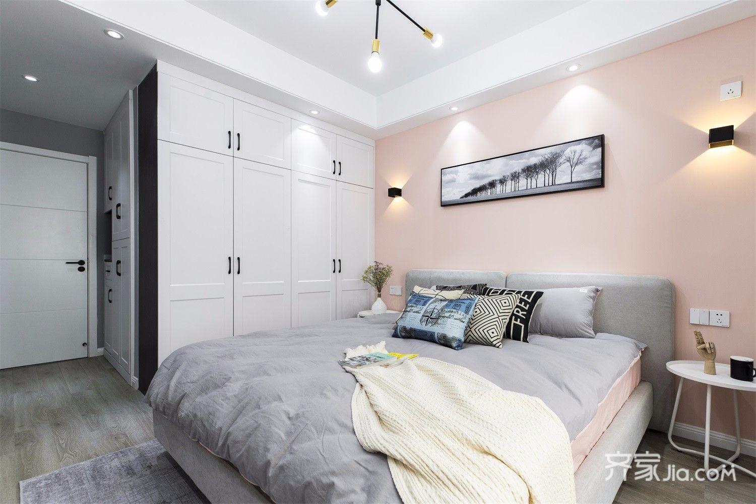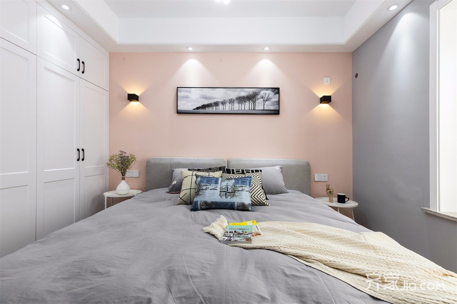 定制一体家具,既美观,也大方。灰色的墙面,显得格外舒适