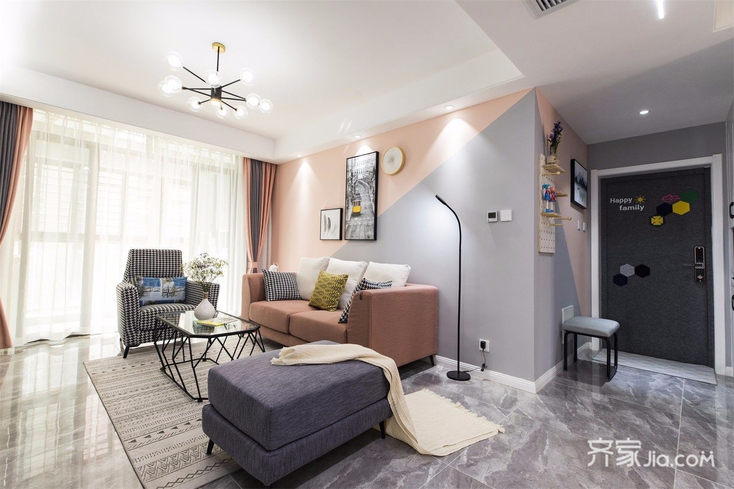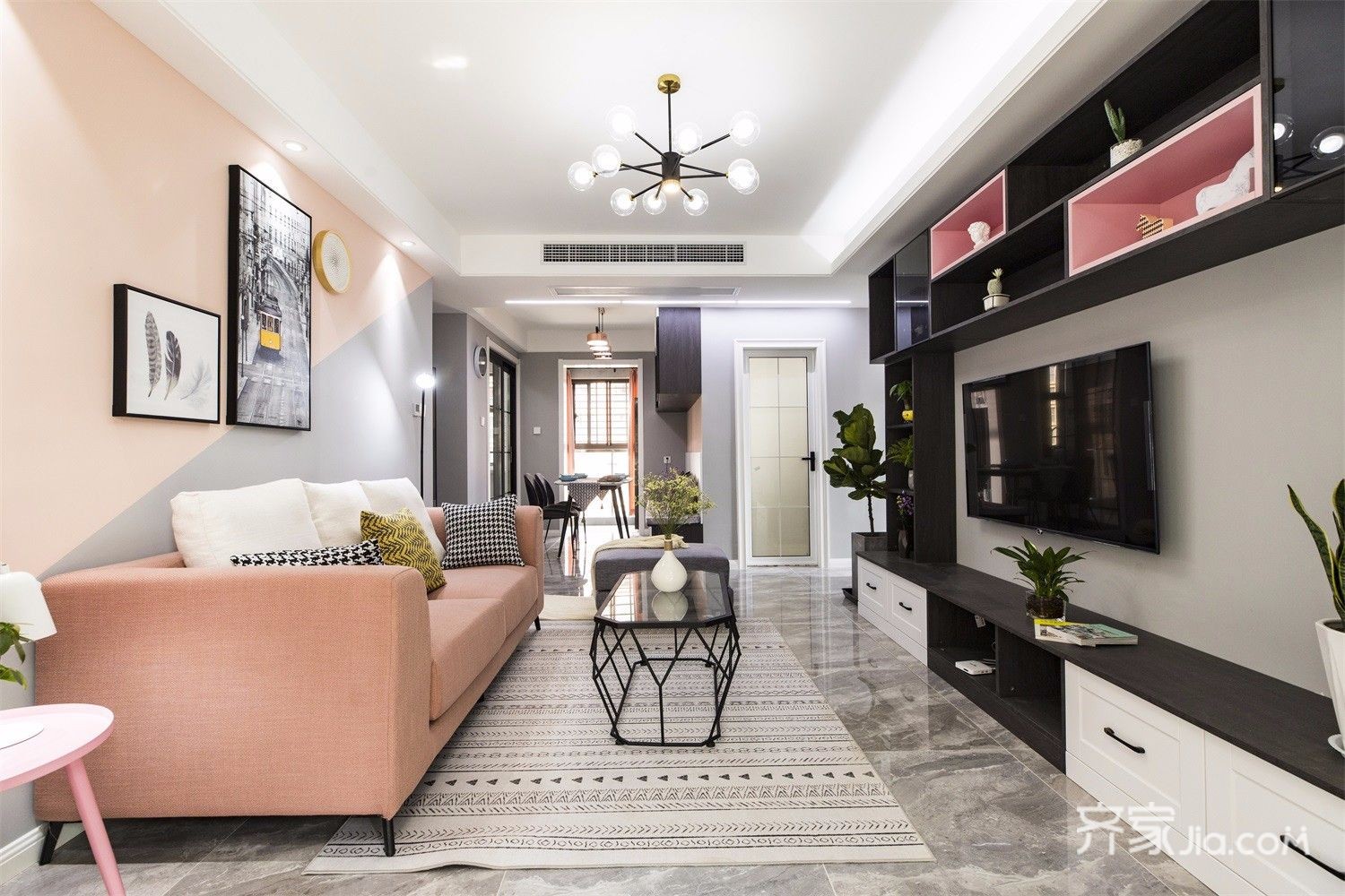沙发背景冷暖拼色的搭配,加上地面大理石,显得格外大气。