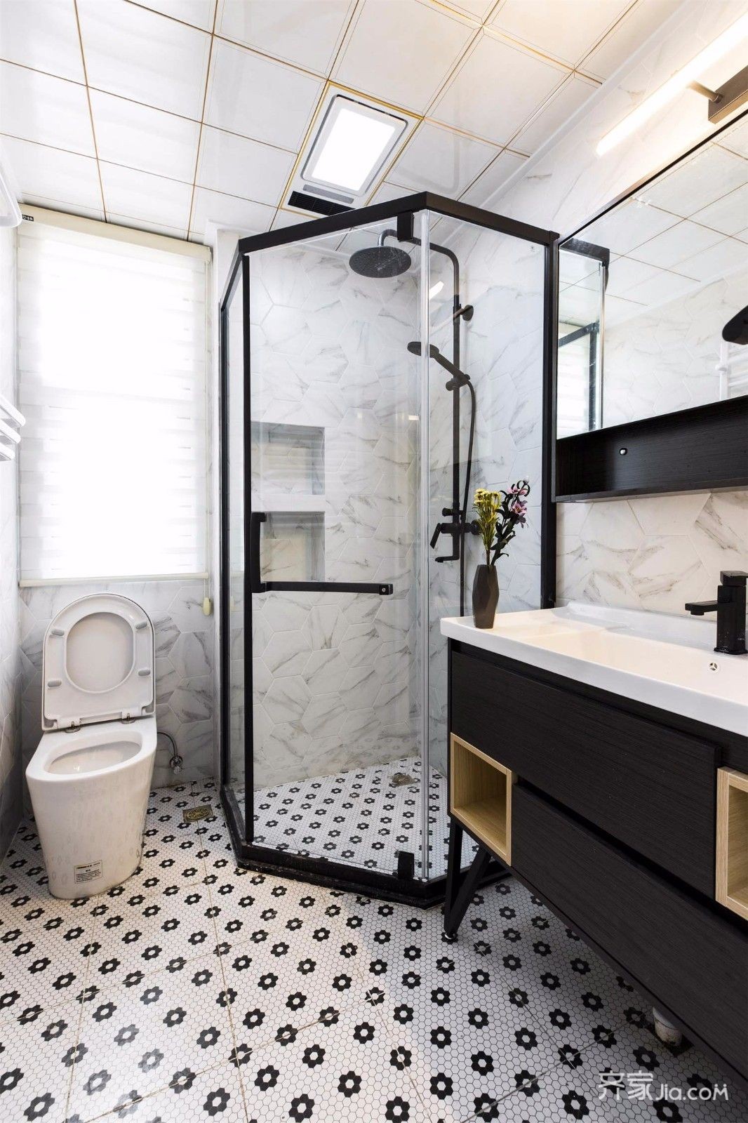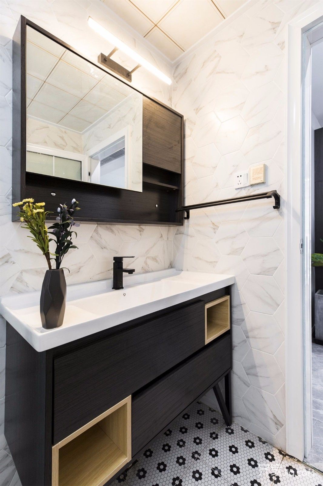 墙面的六角花片,和深色的浴室柜,黑白灰的协调,时尚,温馨。